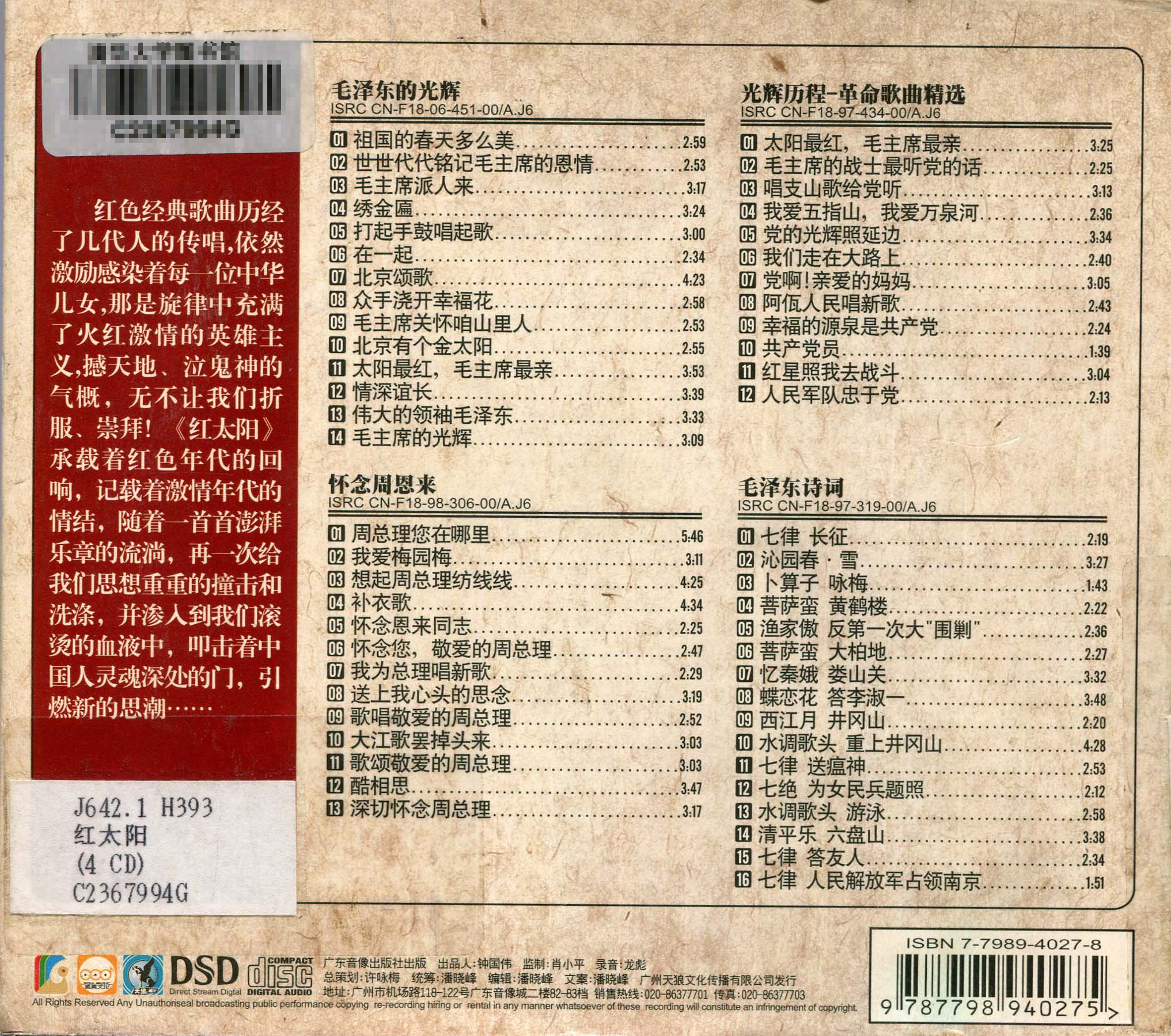 一般性附注 :红色经典歌曲历经了几代人的传唱,依然激励感染着每一位中华儿女,那是旋律中充满了火红激情的英雄主义,撼天地,泣鬼神的气概,无不让我们折服,崇拜!《红太阳》承载着红色年代的回响,记载着激情年代的情结,随着一首首澎湃乐章的流淌,再一次给我们思想重重的撞击和洗涤,并渗入到我们滚烫的血液中,叩击着中国人灵魂深处的门,引燃新的思潮……