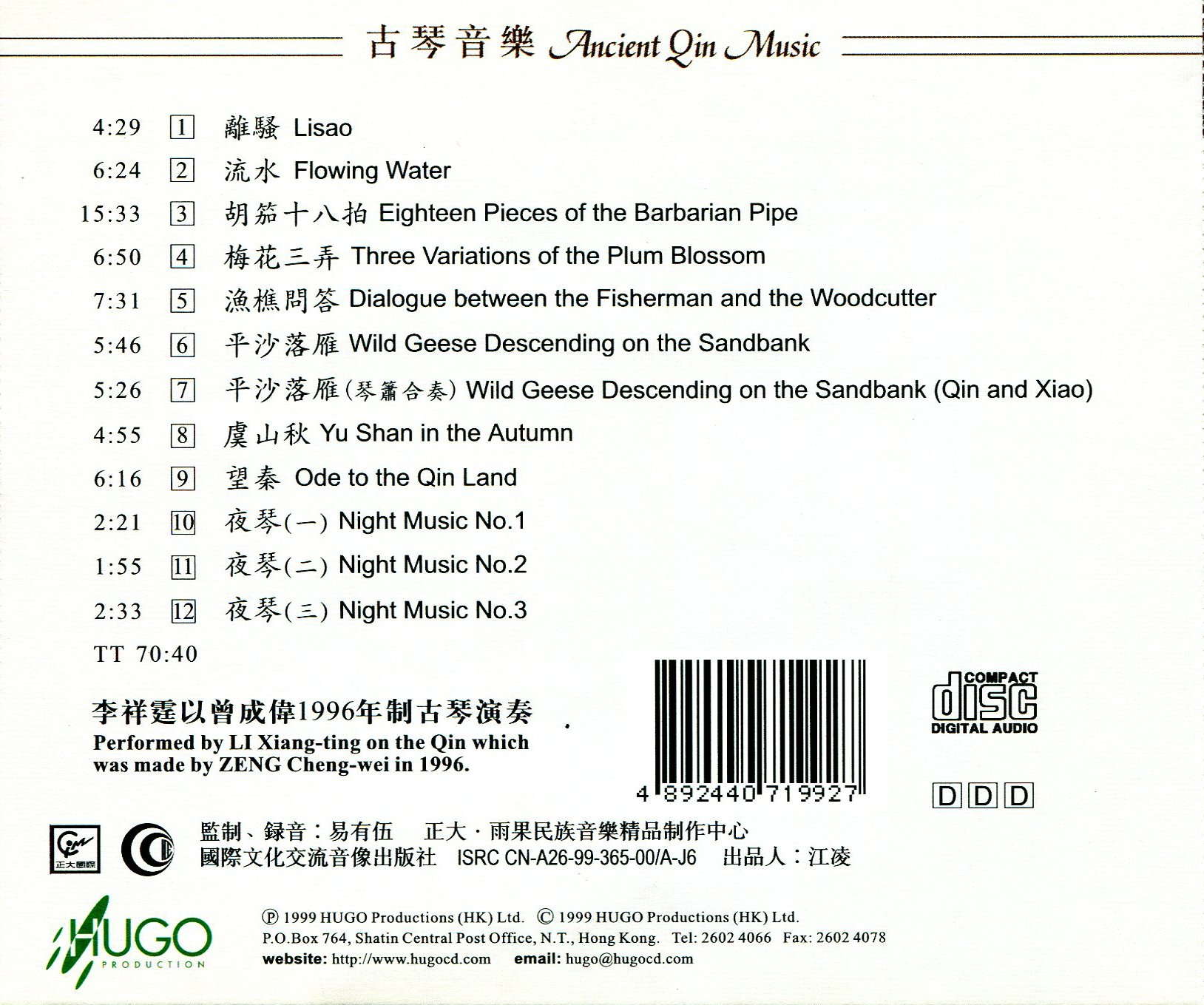 一般性附注 :李祥霆以曾成偉1996年制古琴演奏。