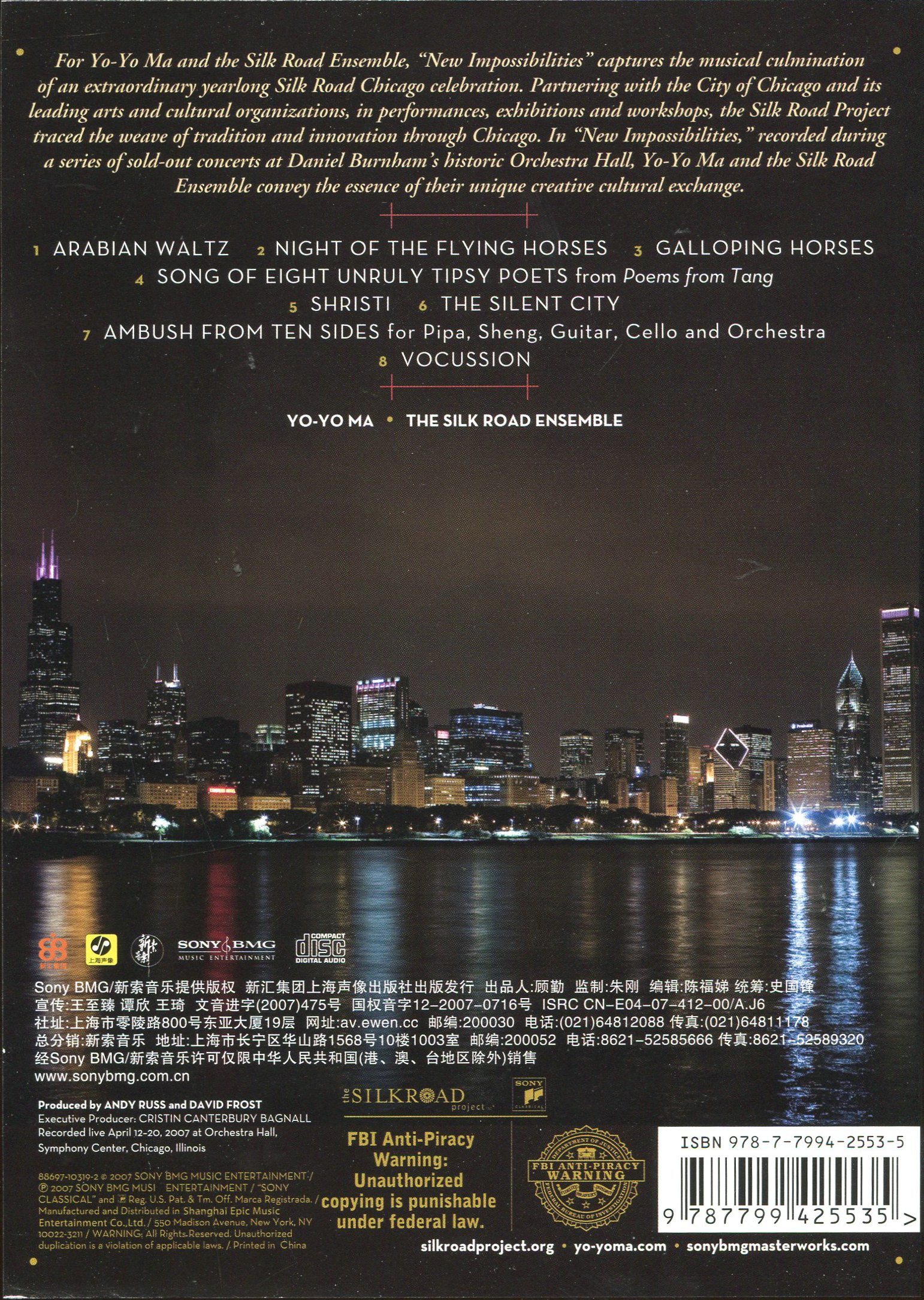 一般性附注 :专辑录制自马友友2007年4月间于芝加哥管弦乐厅举行的“丝路合奏团”音乐会现场。 收录由来自黎巴嫩、阿根廷、伊朗以及中国等国当今最负盛名的作曲家创作的八首乐曲。 马友友、“丝路合奏团”顶尖民族音乐演奏家、Miguel Harth-Bedoya指挥芝加哥交响乐团合作出演。 完美呈现东西音乐文化的交流融合!体现传统与创新的最佳典范!