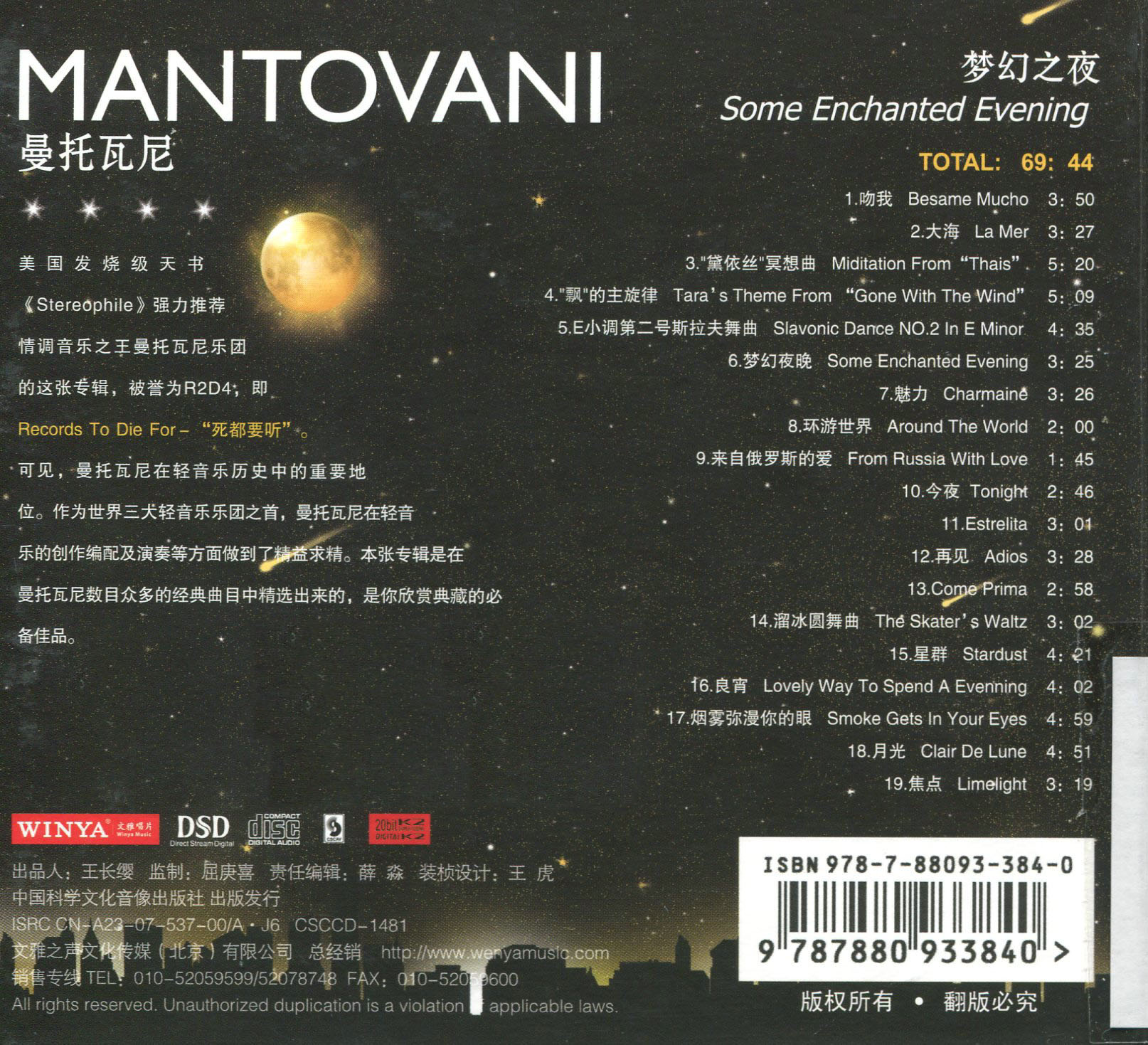 一般性附注 :美国发烧级天书Sterophile强力推荐,情调音乐之王曼托瓦尼乐团的这张专辑,被誉为R2D4,即Records To Die For-“死都要听”。可见,曼托瓦尼在轻音乐历史中的重要地位。作为世界三大轻音乐乐团之首,曼托瓦尼在轻音乐的创作编配及演奏等方面做到了精益求精。本张专辑是在曼托瓦尼数目众多的经典曲目中精选出来的,是你欣赏典藏的必备佳品。