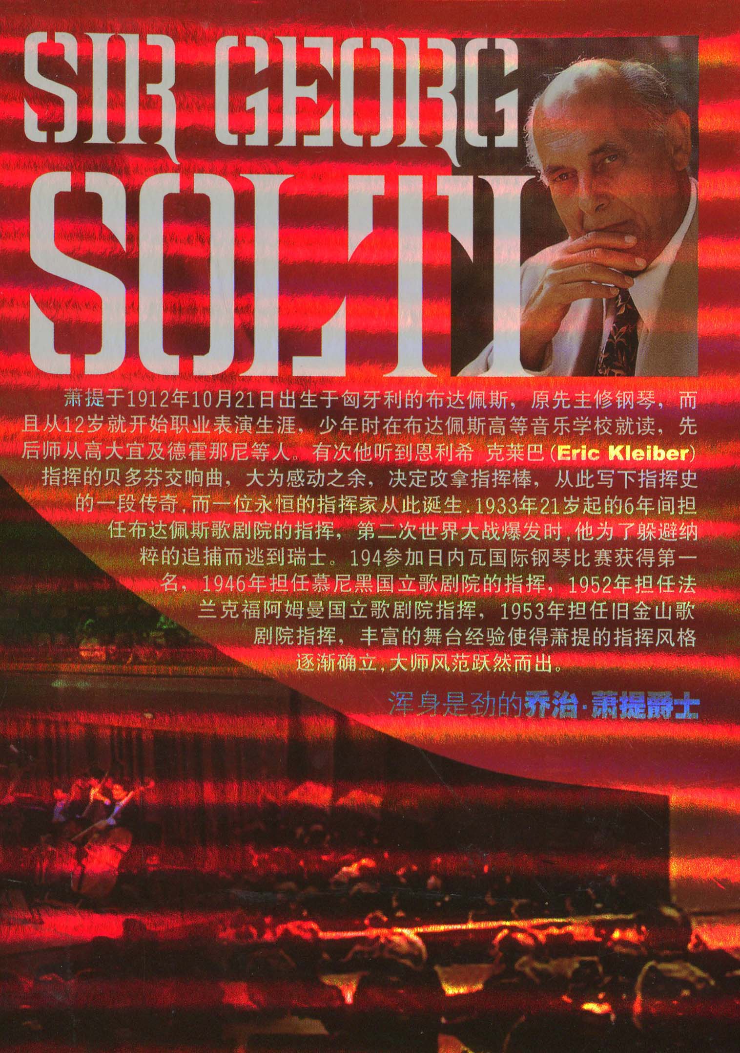 萧提于1912年10月21日出生于匈牙利的布达佩斯,原先主修钢琴,而且从12岁就开始职业表演生涯,少年时在布达佩斯高等音乐学校就读,先后师从高大宜及德霍纳尼等人。有次他听到恩李希 克莱巴(Eric Kleiber)指挥的贝多芬交响曲,大为感动之余,决定改拿指挥棒,从此写下指挥史的一段传奇,而一位永恒的指挥家从此诞生。1933年21岁起的6年间担任布达佩斯歌剧院的指挥,第二次世界大战爆发时,他为了躲避纳粹的追捕而逃到瑞士。1944年参加日内瓦国际钢琴比赛获得第一名,1946年担任慕尼黑国立歌剧院指挥,1952年担任法兰克福阿姆国立歌剧院指挥,1953年担任旧金山歌剧院指挥,丰富的舞台经验使得萧提的指挥风格逐渐确立,大师风范跃然而出。