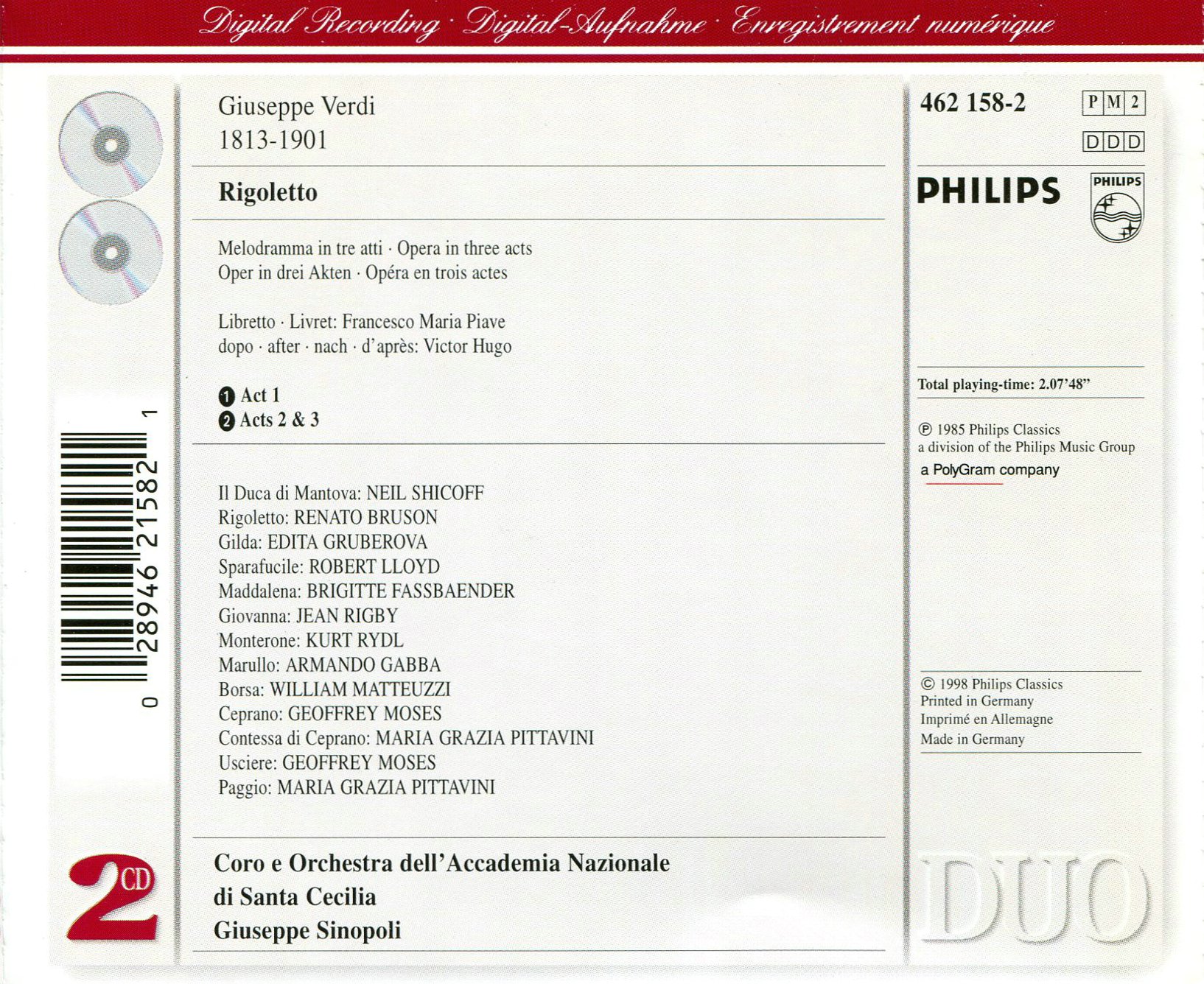 参演者 :Il Duca di Mantova: Neil Shicoff; Rigoletto: Renato Bruson; Gilda: Edita Gruberova; Sparafucile: Robert Lloyd; Maddalena: Brigitte Fassbaender; Giovanna: Jean Rigby; Monterone: Kurt Rydl; Marullo: Armando Gabba; Borsa: William Matteuzzi; Ceprano: Geoffrey Moses; Contessa di Ceprano: Maria Grazia Pittavini.