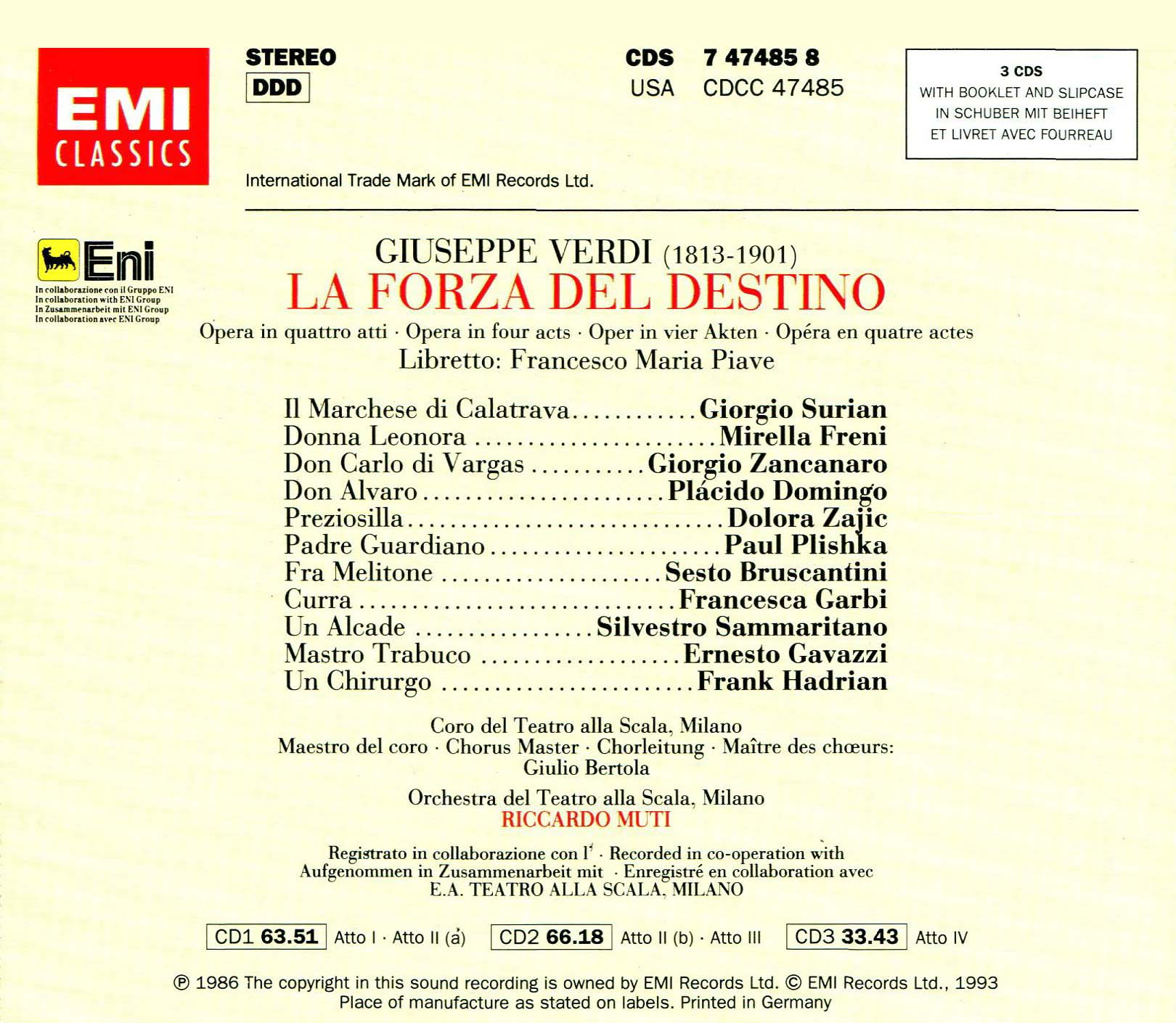 参演者 :Il Marchese di Calatrava:Giorgio Surian; Donna Leonora:Mirella Freni; Don Carlo di Vargas; Giorgio Zancanaro; Don Alvaro: Placido Domingo; Preziosilla: Dolora Zajie; Padre Guardiano: Paul Plishka; Fra Melitone: Sesto Bruscantini; Gurra; Francesca Garbi; Un Alcade: Silvestro Sammaritano; Mastro Trabuco: Ernesto Gavazzi; Un Chirurgo: Frank Hadrian.
