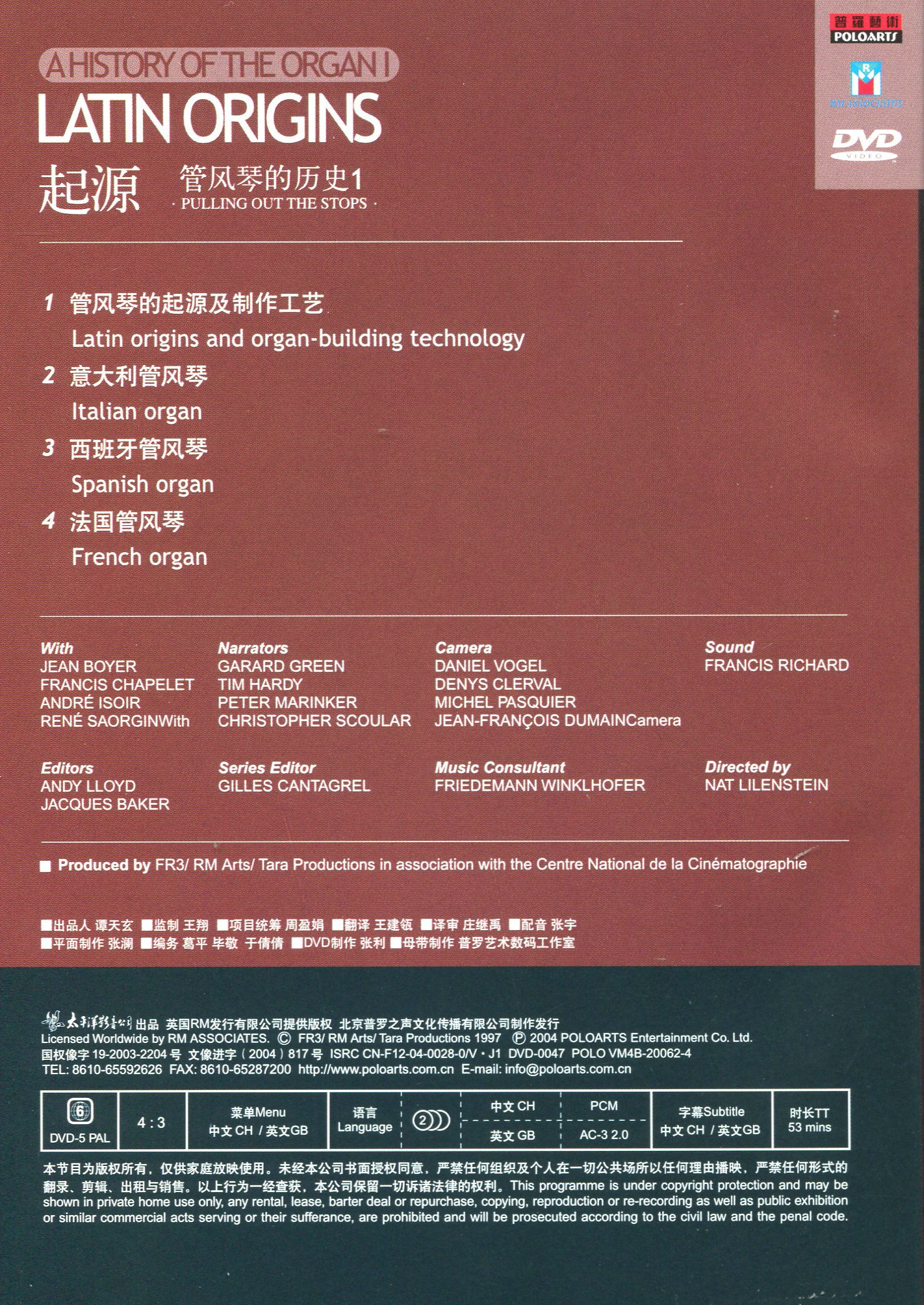 《管风琴的历史》一套共4DVD:分别是《起源》《从斯韦林克到巴赫》《黄金时代》《现代管风琴》。4DVD共一本手册《管风琴》。