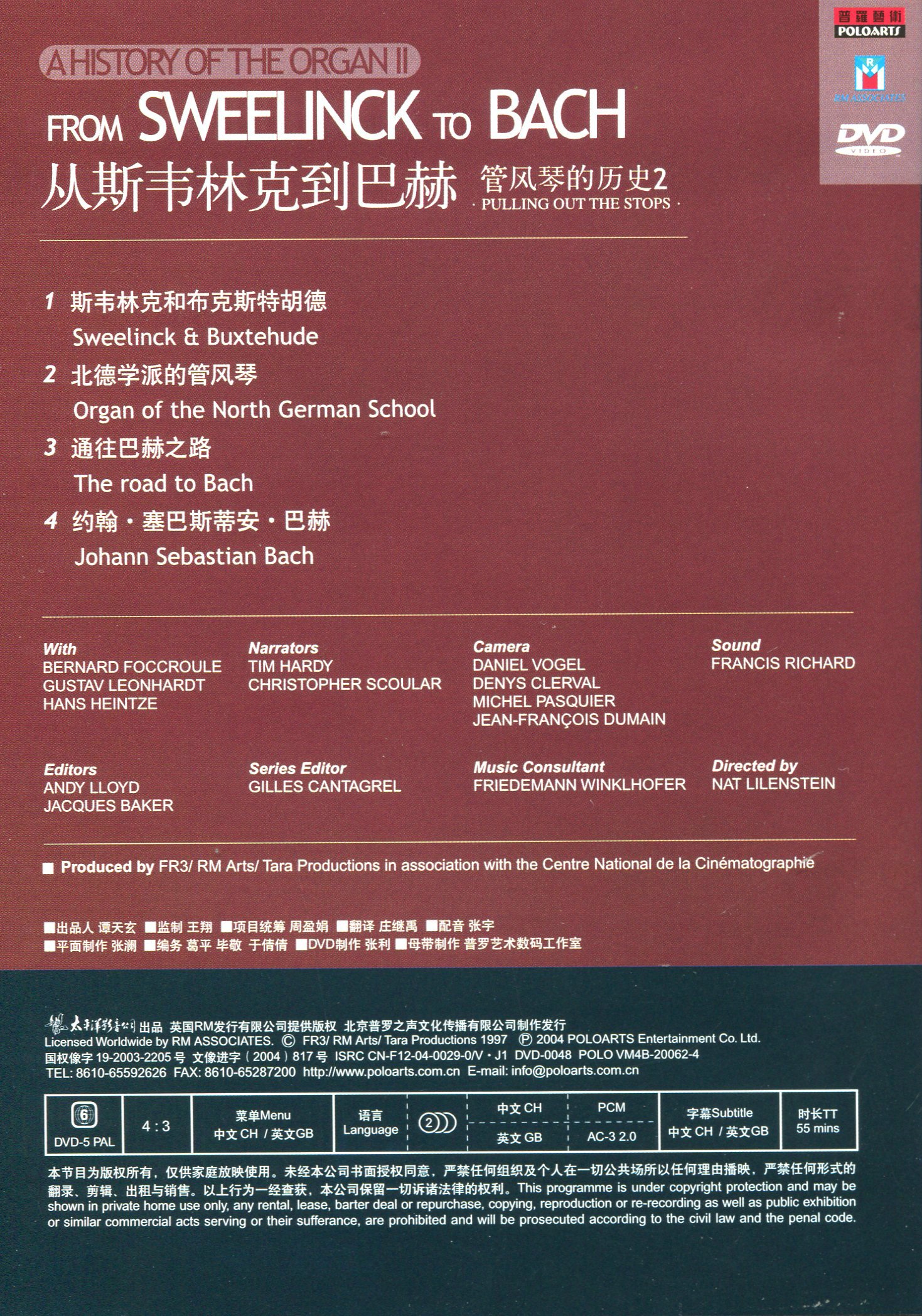 《管风琴的历史》一套共4DVD:分别是《起源》《从斯韦林克到巴赫》《黄金时代》《现代管风琴》。4DVD共一本手册《管风琴》。